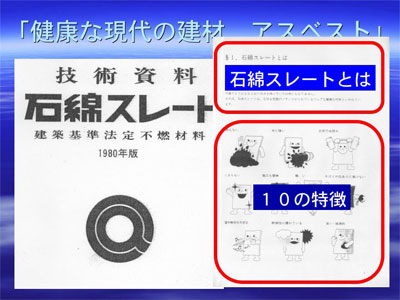 これも古い資料ですが、1980年に石綿協会が出した「石綿スレートの」資料です。この1ページ「石綿スレートとは」という記載があって、「優れた10の特徴」としてこう書いてある。まさにここが石綿の怖さですが、「石綿は、健康な現代の建築材料です。」建材にいろいろ一長一短がありながら、「石綿スレートはあらゆる性能のバランスがとれているフェアな健康な材料です。」と書いてあります。次に「10の特徴」とあり、「燃えない。だから不燃材に使われる。水に強い。だから風呂場や洗面所の壁に使われる。丈夫で長持ち。腐りません。施工も簡単。柔らかくて簡単にのこぎりで切れます。軽い。ネズミや白アリに負けない。遮音性、防音性、断熱性がある。耐侯性がある。従って、外壁とかに使われる。そして何より安い。経済性がある」と書いてあるのです。こうやって70年代に輸入のピークを迎えて、その多くが建材に使われたといわれていますが、まさにこういう認識のもとで使われてきたのだと思います。このパンフレットの10の特性ゆえに、さまざまな部位で石綿建材は使われてきました。大規模な物件では、一定規模でアスベスト含有を特定できますし、石綿含有建材の対策も講じやすいと思います。仮にこの会議室の天井がアスベスト含有で、わかっていれば養生して剥がすことができますが、中小規模物件では、石綿含有建材の徹底した対策をとることはきわめて困難であるのが現状です。