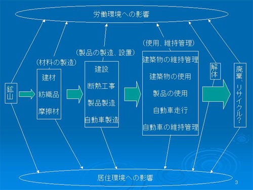 今日は環境曝露についてのお話をさせていただきます。こちらはいろいろな発生源からの曝露、汚染の可能性についての図です。アスベストは鉱石からとりだして材料を作り、製品を作っていくことになります。今後、建物については解体が増えてくるという話がありますし、廃棄されたものや、ものによってはリサイクルが考えられます。こういった一連のライフサイクルで居住環境への影響が考えられます。