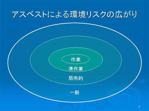 今のようなことをリスクの広がりという形で考えた場合に、最初にあがるのは作業環境です。その周りに家族曝露などが生じている準作業があります。さらに局所的と書いてありますが、例えば工場、非常に交通量の多い道路の周辺、天井に吹き付けアスベストがあるような屋内といったように、少し濃度が低いが普通の環境より濃度が高いところがあります。さらにその周りに一般的環境があります。そこでは、自然に存在するものに加えて人工的な活動からアスベストが飛散しています。