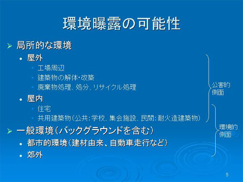 環境曝露には公害的な側面もあります。特に工場、あるいは建築物の解体・改築では発生源がかなり特定できます。周辺被害が明確になれば、公害が起きているという話になるのではないでしょうか。そして、一般環境まで含めると公害とは少し違う環境問題になってくるかもしれません。