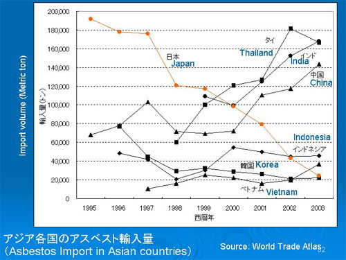 また、日本ではだんだんアスベスト使用量が減ってきていますが、量が増えている国があります。タイ、インド、中国といったところでは、増加の傾向にあります。日本で禁止されても、こういった国で増えている状況がありますので、考慮していく必要があると思います。