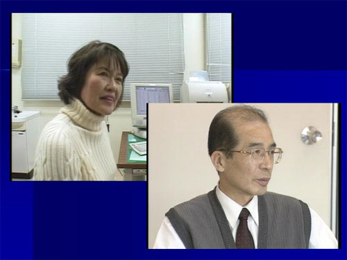今年1月29日に放映されたドキュメンタリー工房・朝日放送制作『終わりなき葬列』の1シーンで、左が土井さん、右が古川さんです。手術取材の後、ディレクターが我々の事務所に来ました。この土井さんがアスベストをどこで吸ったかわからない、会っていただきたいということでした。僕もいっしょに会って話を聞きましたが、土井さんの職歴はウエイトレスをやり、結婚後はたこやき屋をしていたということで、アスベスト曝露歴はさっぱりわかりませんでした。事務所に帰ってきて、これは吹き付けアスベストを吸ったのではないかということを考えました。土井さんは尼崎市立の小、中学校に通っていました。市教委を通して調べましたが、違うことがわかりまして、またわからなくなりました。