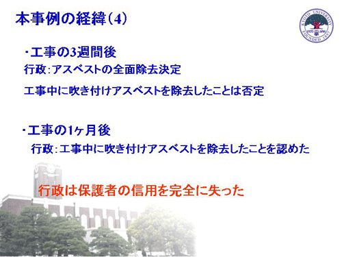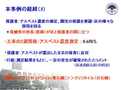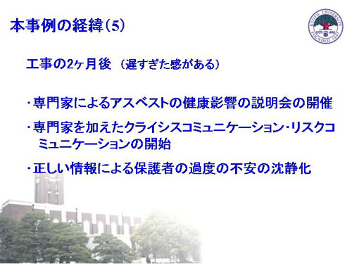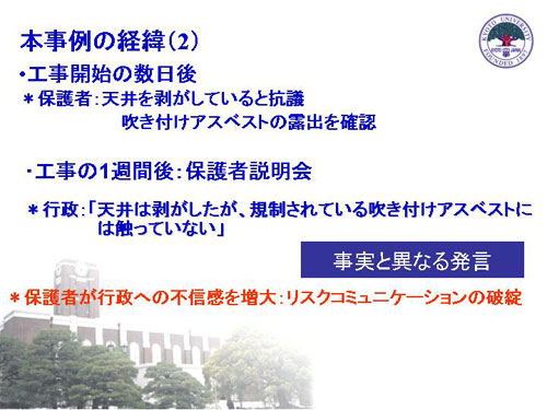リスクコミュニケーションの立場からも考えながらお話をいたしますと、ここで事前に保護者の方からこういう注意をして欲しいという要望が出たわけですから、それに対して行政が十分に応え、適切な処置が取られていれば、アスベストばく露に関してはリスクコミュニケーションが図られて、リスクが非常に削減、低減できた、あるいはゼロにできたわけです。しかしここで行政がこういう答えをしてしまって、工事が始まってしまったために、まずコミュニケーションがうまくいく機会を失ってしまいました。