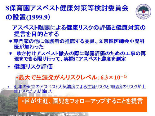 その後、99年9月に文京区の中にアスベスト健康対策等専門検討委員会が設置されました。そのときに、私どもがお引き受けする一つの条件としましたのは、行政と保護者の信頼関係が全く失われておりましたので、私としては行政から頼まれて行った訳ですが、行政が選んだ委員だけではまず信用してもらえないだろうということで、私どもが推薦する専門家の他に保護者の推薦する委員をぜひ入れて欲しい、それから長くフォローするときには地元、文京区の医師会の方にも入っていただきたいということでした。