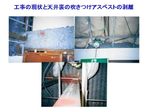 これは永倉さん(中皮腫・じん肺・アスベストセンター)が撮ってくれた写真ですが、吹き付けアスベストがむき出しになっているのが、下から見えるわけです。支柱を立てるために一部が剥離されているという図です。