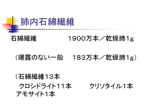 残念ですがお亡くなりになりまして、解剖した肺を調べますと、乾燥肺の1グラム中に72本の石綿小体が検出されました。これは石綿の繊維を中心にして、たんぱく質と血液由来の鉄等が付きまして、茶色く見えるのです。石綿に特徴的なこの石綿小体が1グラムあたり72本で、全く曝露の無い方は乾燥肺1グラム中35本くらいです。職業性石綿曝露の方は、乾燥肺1000本から1万本の単位です。ちょうど全く曝露の無い方の2倍、職業性の方と比べると一桁オーダーが低いという状態です。