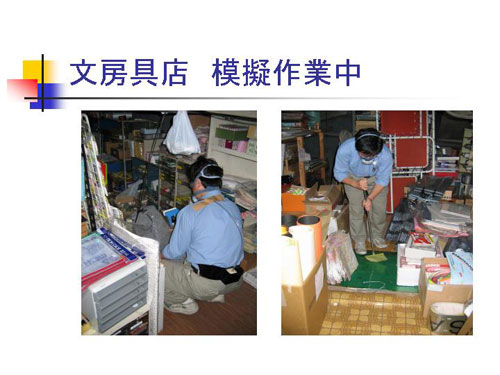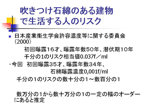 作業環境測定士の外山さんの測定データですが、自宅の屋外や文房具店の外の屋外は定量下限値以下、基本的には0.1f/Lとかの値でございます。文房具店の1階が0.68 f/L、静かな状態でも2階は3.05f/L、物を搬入すると床の石綿が飛び散りますから、14 f/L。さらに掃いたりすると136 f/Lと。普通の状態では3.05f /Lということで、石綿濃度は職業性曝露に比べて非常に低いのです。低濃度の曝露だが、滞在時間が長い方という事が良くわかりました。