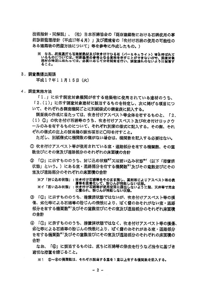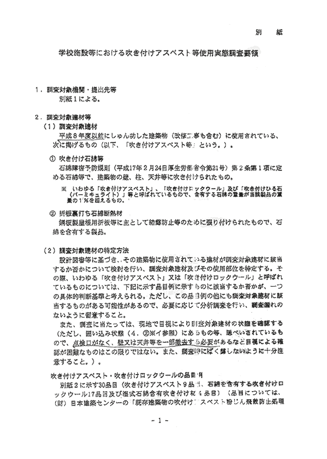 それから同資料の2ページに、「4.調査実施方法」の?B「吹きつけアスベスト等の損傷、劣化等による石綿等の粉塵の飛散により・・・」とあります(資料/「文部省通達 2/3」)。