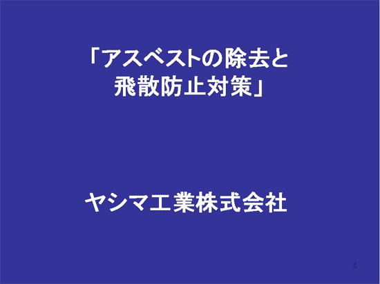 松岡: 皆さん、こんばんは。ヤシマ工業の松岡と申します。今、我々がすべきことは何か、これからどういう形で夏の吹きつけ石綿除去工事が動くのだろうかということを、かいつまんでお話させていただきたいと思います。