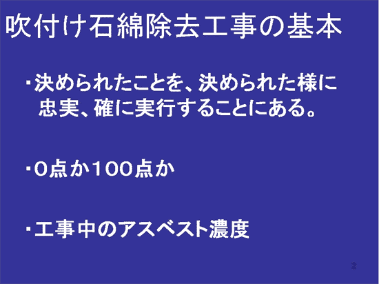 作業員では、当然自分の体は自分で守る。自分の体を自分で守らない人は、2次ばく露を起こす危険性が必ずあります。私どもの会社も、70人くらいのワーカーがいます。時々入れ替えをします。なぜならば現場管理者(監督者)の言うことをきかない人は、退場願わざるを得ないのです。性格的にこの工事に不適切な方は、かなり居ます。君はやはりだめだ、別の仕事をしなさいということで、そのくらい徹底することです。以上3つの点が、吹きつけ石綿除去業に必要です。