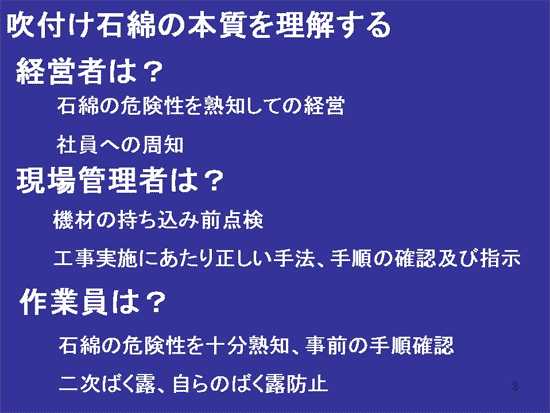 一つは、経営者が石綿の危険性をどう理解するかです。基本的な物性で、細かくなって飛散する、これを吸い込めば悪性中皮腫等いろいろな病気が発生する。この事をやはり経営者が熟知しないと駄目です。本当にアスベストの危険性を熟知し、それを社員に通達する。除去業者は少しブームになっていて、1m2/2万円か3万円というから、うちもやってみるか、儲けたろうじゃないかというような、それはそれでいいのですが、その段階で経営者の方は勉強していただきたい。