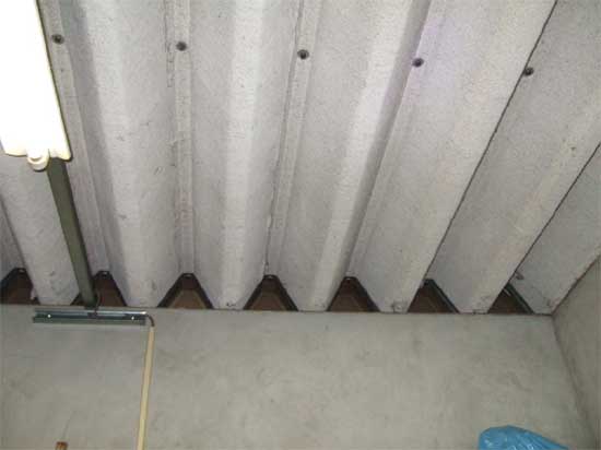 今年の夏の工事は、教室の天井に吹付けアスベストがむき出しであり除去する工事はほとんど無く、後でお話しますが、一番多いのは既に囲い込み工事をされている部分です。体育館とか、写真の所に吹いてあるアスベスト除去が大変多い。見ていただくとわかるように、軽量鉄骨で支えています。その間は折板ですから向こうに抜けています。それで、この養生をどうするのだということです。