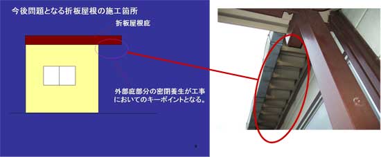 実際に折板屋根というのは庇が出ています。庇の裏にアスベストを吹いてあるのでどうするか。正しいやり方としては、外側に足場を組んで、密閉養生を部分的にして、やらなければいけない。ところが現実問題うまくしていないのが現実だと思います。