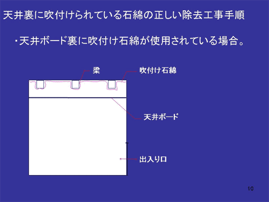 もう一つ、今年学校や色々なセンターで多いのは、上の図の様に天井裏にアスベストが吹いてあって、更に天井ボードが貼ってある場合です。通常コンクリート(RC)製の建物でアスベストが吹いてあり、その上に天井を貼ることはありえません。これは恐らく20年くらい前に、石綿が問題となった時、エンクロージャー(囲い込み)をしたということです。私から言いますと「隠し込み」で、実際こういう現場がたくさんあります。