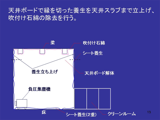 天井ボードを撤去したら、ここでもう一度養生を天井スラブのアスベストのある所まで立ち上げて、それから除去工事を進める。これが現実的で正しい工事なのです。ところが実際には、先に養生なしで天井ボードを外す工事を行い吹付け石綿のある部分を裸にした上で養生をしている除去業者が多く見られます。その段階で石綿が飛散してしまっているから、もう遅いです。これが今年の夏、現実に多々起きる恐れがある工事と思います。