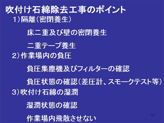 では我々、また皆さんが、何をどうポイントで見ればいいのかということをお話しします。まず、事故が最も多いのは密閉養生が悪くて、これがはがれて漏れるということです。したがいまして密閉養生を徹底させる。それには床を0.15ミリで2重に必ず覆い、なおかつ立ち上がりを30センチくらい取る。その上から壁養生をしましょうと。これが絶対条件です。次に作業場内の負圧です。これは負圧集塵機でおこないます。大体基本的には作業エリアの空気を1時間に4回以上入れ換える。その能力がある負圧が通常通りセットされているのだろうかということが一つ。もう一つはフィルターです。HEPAフィルターが入っています。これが「何時間でお宅の会社はメンテナンスで交換しているのですか」、「そういえば、1年くらいしていないな。」ということがある。こういうことがきちんとされているかどうか。負圧状態を確認するために差圧計やスモークテストをやりながら、現実の負圧を確認していく。それから、吹き付け石綿の除去作業で最も大切なのは、濡らすことです。濡らせばその時点ではそれほど怖いものではないです。徹底して濡らすということをトレーニングしていくということが大切です。