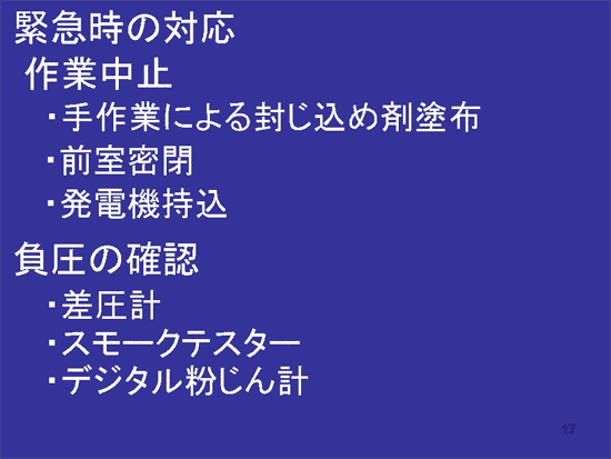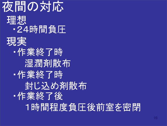 夜間の対応は、実は大変難しい問題です。仕事が終わって夜間どうするか。理想的には24時間負圧機を回す。しかしいろいろな条件でそうはいかない。したがって作業終了時には、この3つのことをきちっと実施して作業上を閉鎖する。これが、現実的に仕事がわかっている人たちと、そうでない人たちで大きく差がつくと思います。