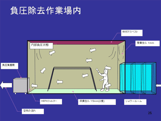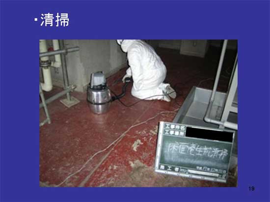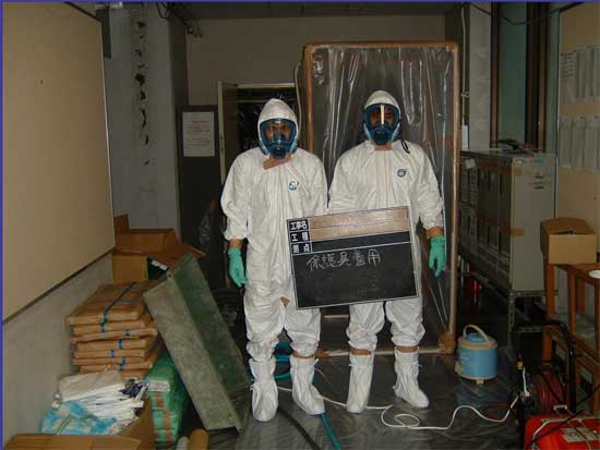 これがアスベストを除去する作業員の実際の姿です。マスク、手袋は中に置きますが、それ以外は全部一回ごとに廃棄します。
