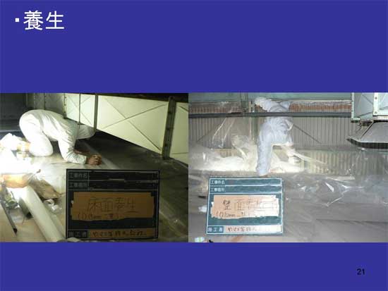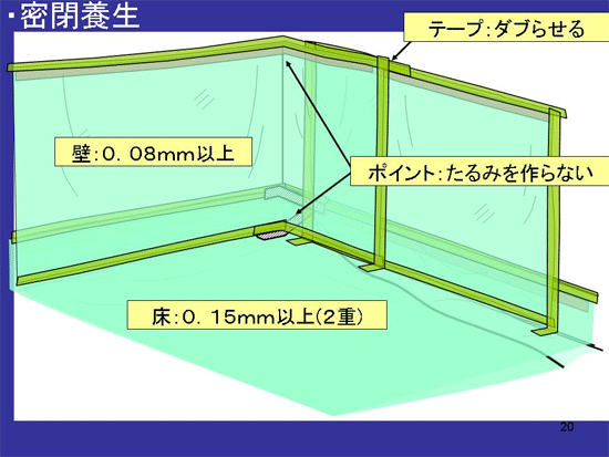 これが養生の仕方です。まず床を養生します。床から壁に30センチは最低立ち上げます。袋状にします。両面テープ等を使いまして、完全に固定したところへ、壁の養生を行います。床は0.15ミリ以上で2重にする。壁を0.08以上のもので1重にする。ただしポイントとしては、たるみを作らないようにしっかりとした張りをしましょう、というようなことが密閉養生の正しい方法です。