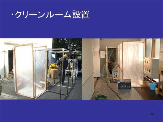 次に現場はいつも問題なく進むわけではありません。停電すると負圧機が止まってしまい、場内も真っ暗になる。その時実際どういう手順で処理するのか。私たちは、作業を中止し手作業で塗布後現場の前室を閉じ、負圧を確認します。