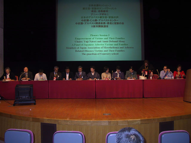 11月19日(金)午後5時からの「セッション3 被災者・家族のエンパワーメント」では、アスベストセンター事務局と、中皮腫・アスベスト疾患患者と家族の会世話人の皆さんの発表がありました。会場は静まり、悲しみと共感が流れました。同時通訳の方の英語がもらい涙でとぎれた瞬間もあった程でした。セッション終了後海外の多くの参加者が、深い所で感動した、と語って下さいました。(セッション3)